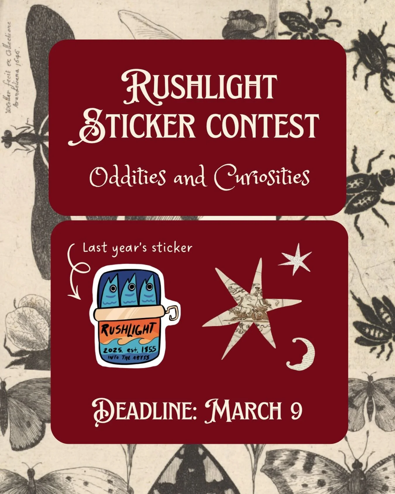 Every year, the Rushlight exec board chooses a theme for our annual issue. While we hope this inspires artists and writers to create interesting and unique works, your submissions do not have to fit the theme in order to be published in Rushlight. This year's theme: Oddities and Curiosities.