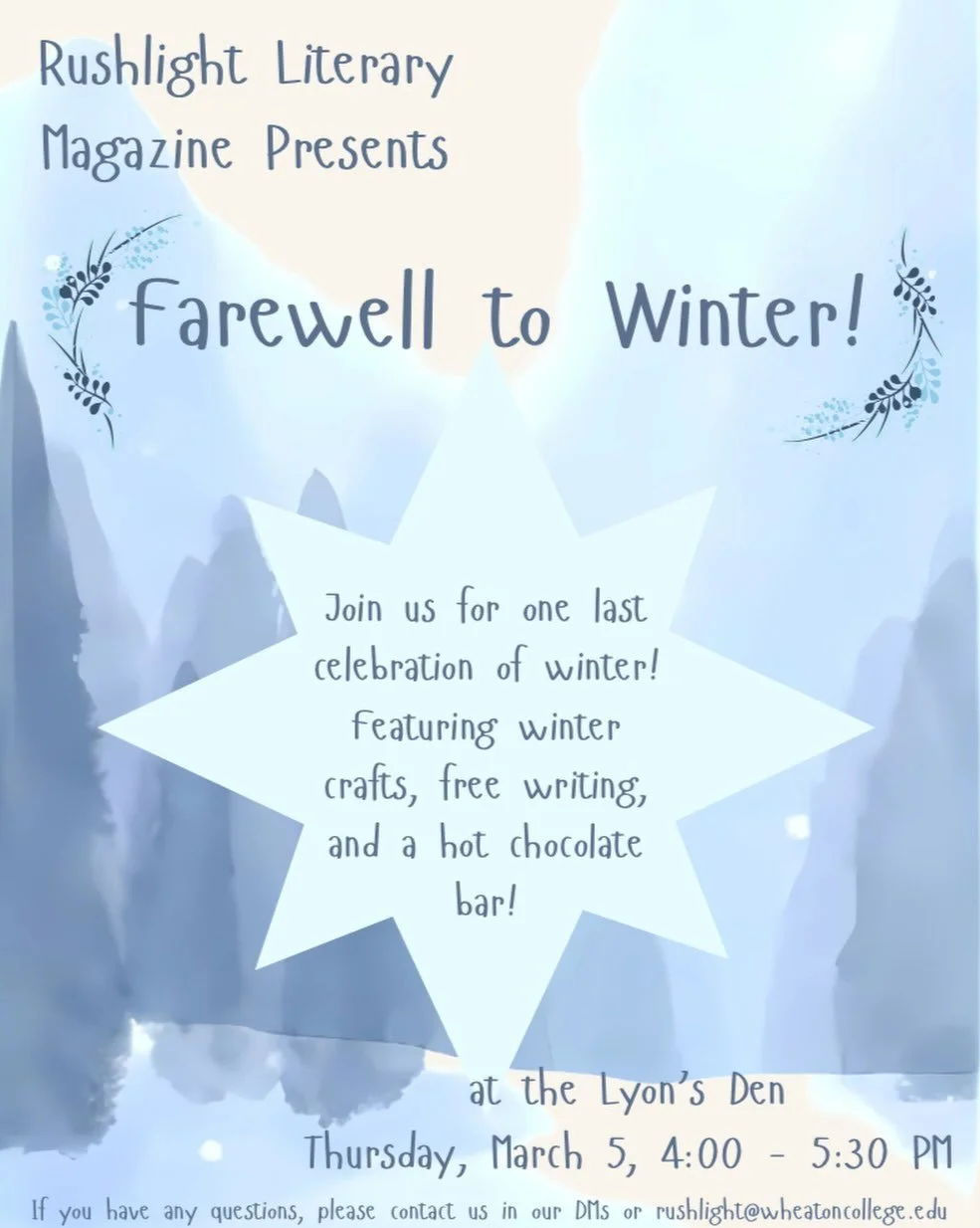 Welcome to Rushlight, your student-led art & literary magazine celebrating the creative voices of fellow students at Wheaton College, MA! Here, your work finds a welcoming home, where passion meets publication. Whether you're a first-time writer or a seasoned creator, we’re excited to support your journey and share your unique stories and art in our next issue. Dive in, explore, and let your creativity shine bright with us!
